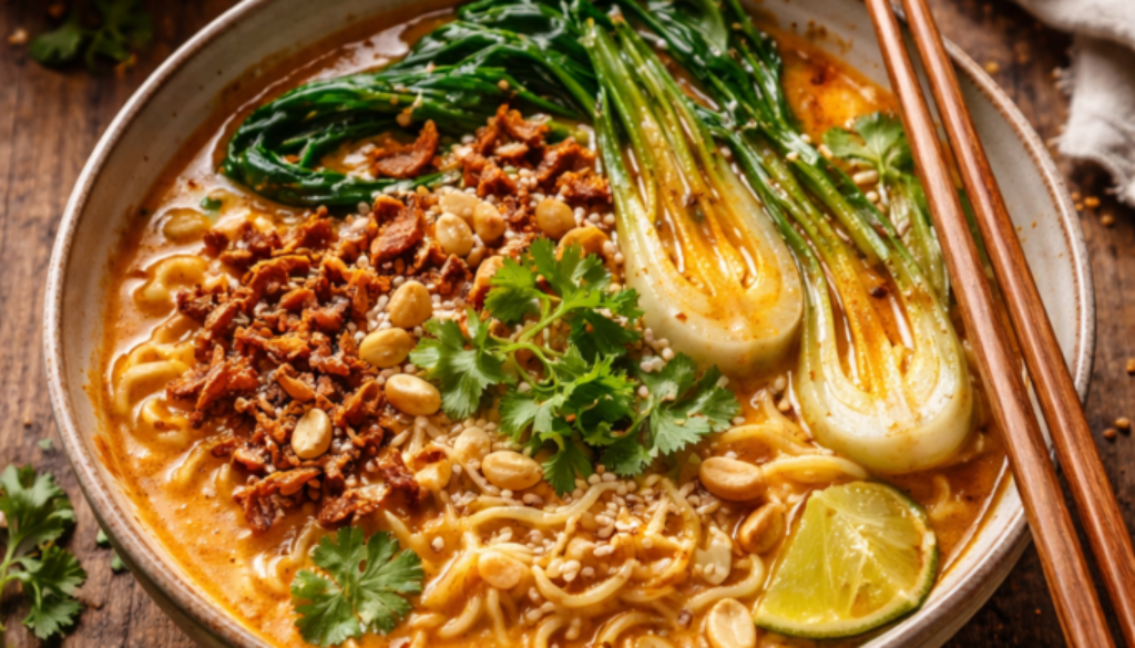 Cremige Curry-Nudelsuppe mit Kokos & Erdnuss – schnell, würzig, sattmachend