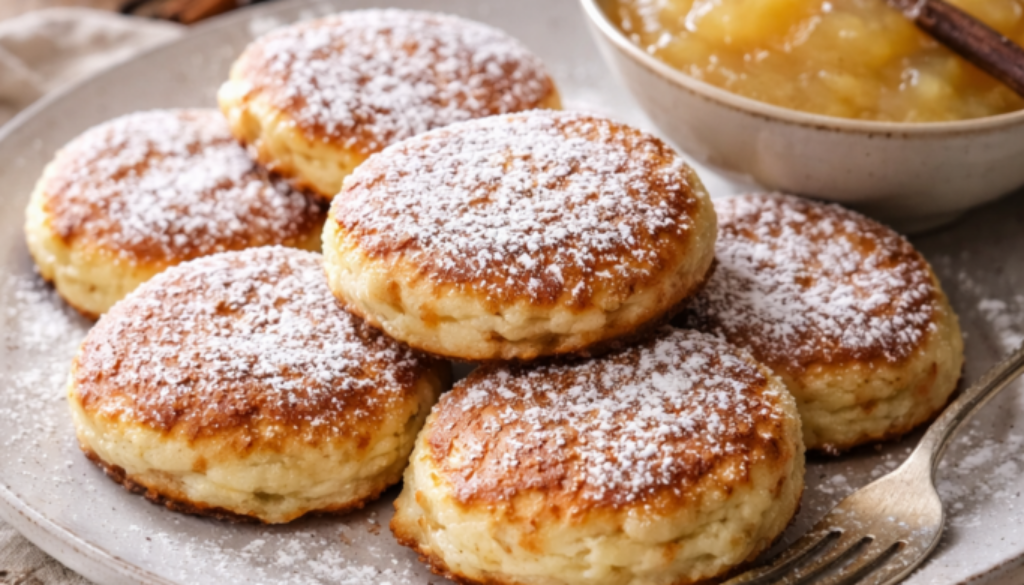 Goldbraune Quarkküchle mit hausgemachtem Vanille-Apfelmus – so saftig gelingen sie dir