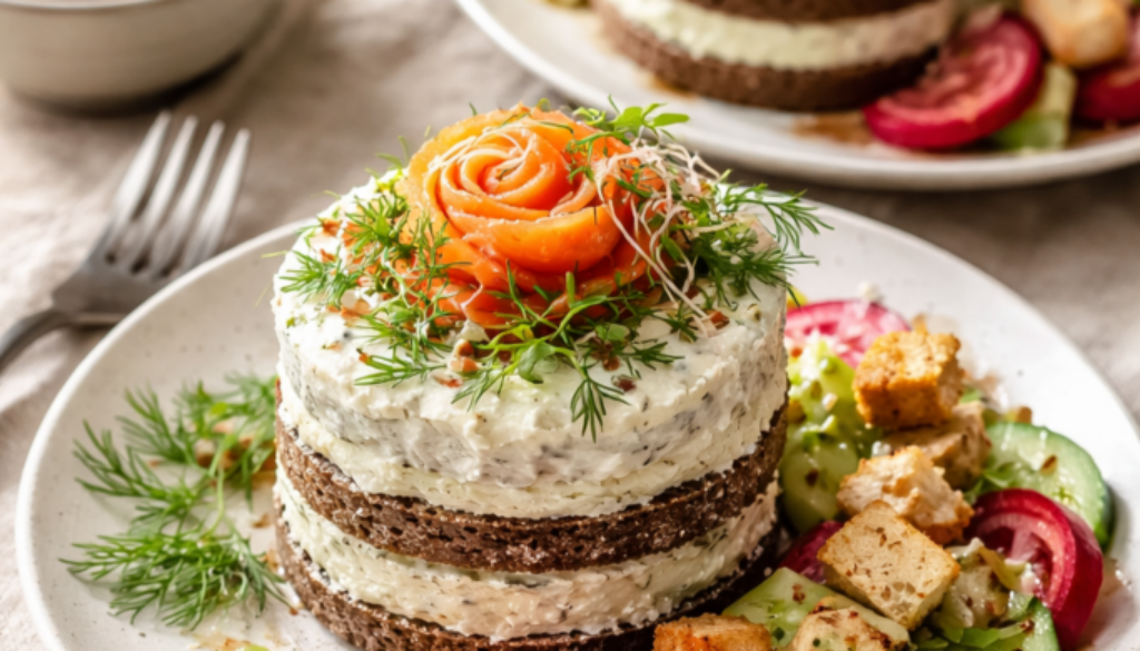 Diese herzhaften Lachs-Törtchen sind ein echtes Highlight für alle, die einfache Zutaten elegant auf den Teller bringen wollen. Kräftiges Vollkornbrot, cremiger Frischkäse und fein geschnittener Lachs ergeben zusammen kleine, stabile Türmchen, die sich wunderbar vorbereiten lassen. Begleitet werden sie von einem frischen Rohkostsalat aus Ringelbete, Gurke und Radieschen – knackig, leicht säuerlich und genau der richtige Gegenpol zur Cremigkeit.