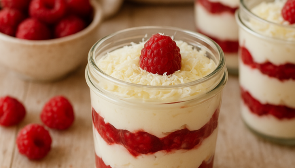 Besonders schön: Du kannst das Dessert komplett vorbereiten und in kleinen Gläsern anrichten, was es ideal für Feiern, Familienessen oder gemütliche Abende macht. Die tiefgekühlten Himbeeren sorgen für eine natürliche Frische – sie wurden meist direkt nach der Ernte schockgefrostet und behalten dadurch erstaunlich viel Aroma. Die geraspelte weiße Schokolade bildet am Ende eine feine, leicht buttrige Krone, die sich sanft über die cremigen Schichten legt.