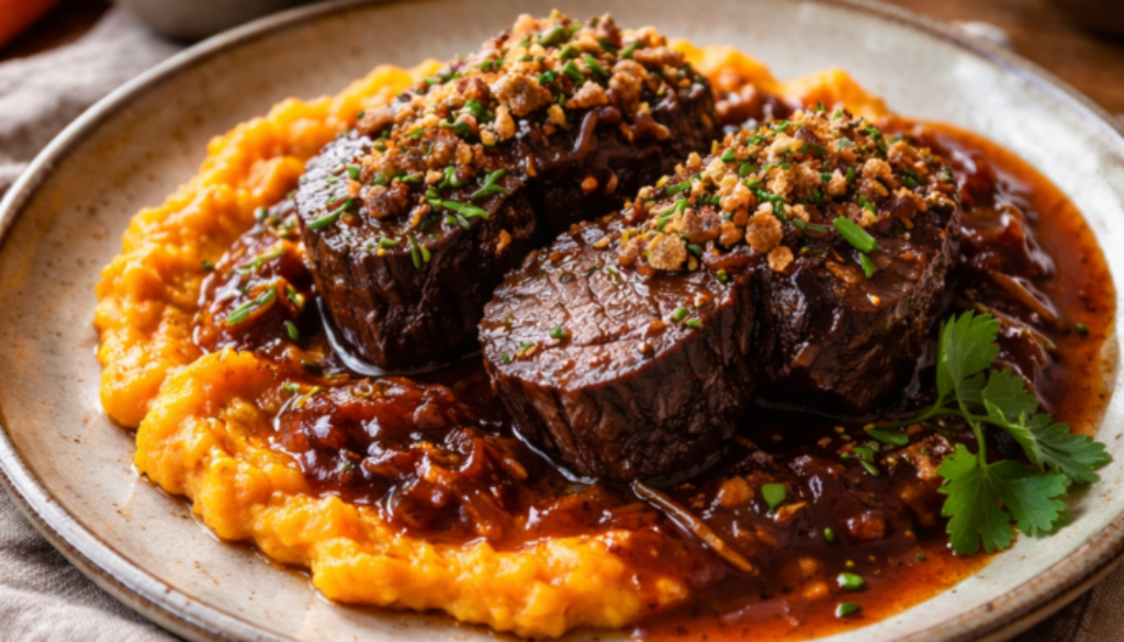 Ochsenbackerl neu entdecken: Schmorgericht mit Crunch und frischem Karottenstampf