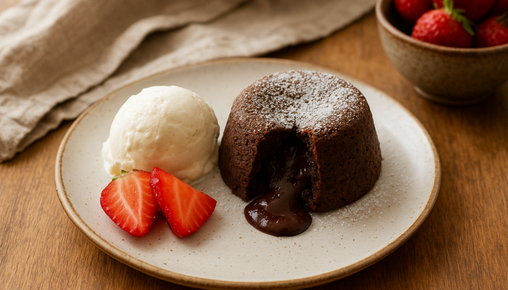 Das Schokotörtchen, oft auch als „Fondant au Chocolat“ bekannt, stammt ursprünglich aus Frankreich. Die Besonderheit liegt in der kurzen Backzeit: Dadurch bleibt der Kern cremig – fast wie eine warme Mousse. Das Zusammenspiel von Temperatur und Textur macht diesen Klassiker so beliebt. Das Schmandeis bringt einen frischen Twist: Es erinnert an klassische Crème fraîche-Eiscremes, die mit feiner Säure und milder Süße punkten.