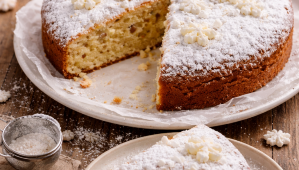 Dieser winterlich-weiße Kuchen ist genau richtig, wenn du etwas Backstubenwärme und helle Genussmomente suchst. Lockerer Rührteig, feine Vanillenoten und kleine Stücke weißer Schokolade sorgen für ein saftiges Ergebnis, das nicht schwer wirkt. Durch den Puderzucker obenauf entsteht ganz nebenbei diese schneebedeckte Optik, die auf dem Tisch sofort ins Auge fällt – ohne großes Tamtam.